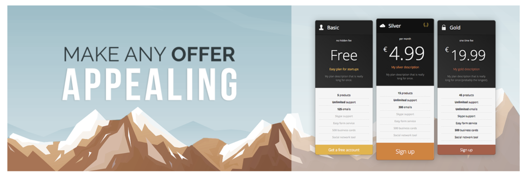 - Notable features: custom CSS, highlight any plan, change currency sign