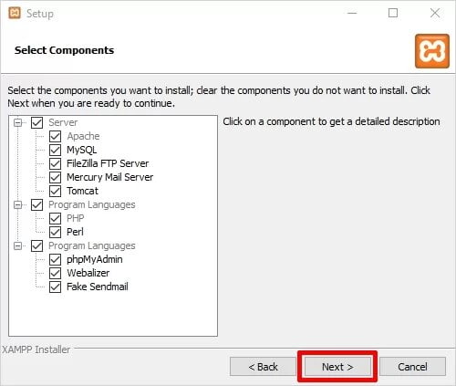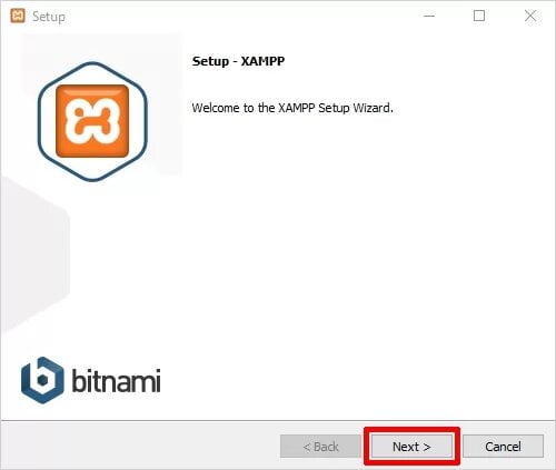 Now the xampp installation wizard has started, click on the Next button and proceed with the installation process: