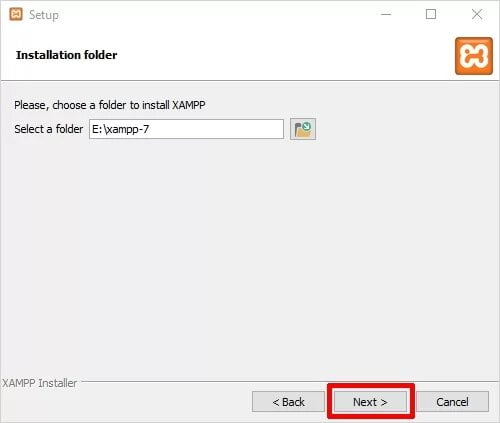 Now you have to select the folder where you want to install XAMPP. You can choose the default location or any location of your choice and select the ‘Next’ button to proceed.