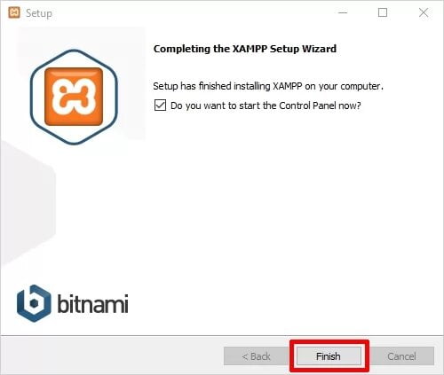 Now the installation is complete with the help of the installer wizard, and the Finish button will be visible on the prompt, click Finish and XAMPP will be ready to start: