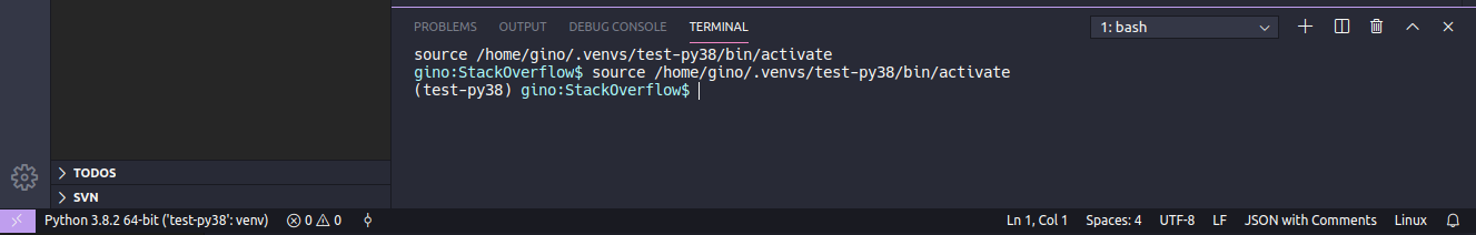 You can check that it’s now using the correct interpreter by looking at the status bar at the bottom and by opening a new terminal: