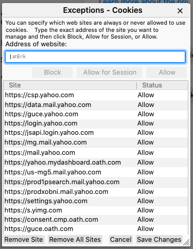 it should by-default have the option “Accept Cookies From Sites” unselected, for now keep it like that, (if not unseleted, then unselect it), in that row in right side, there is a button[ Exceptions ], click on that, then type-in (or copy from here) each of below web-address (URL) into the “Address of Website” textbox, & then press[ Add ]/[ Allow ]button, after all 7-sites are entered, then press[ Save Changes ]:Mail.com (Mobile/Basic Version) web-service: