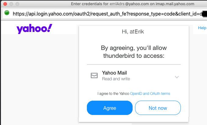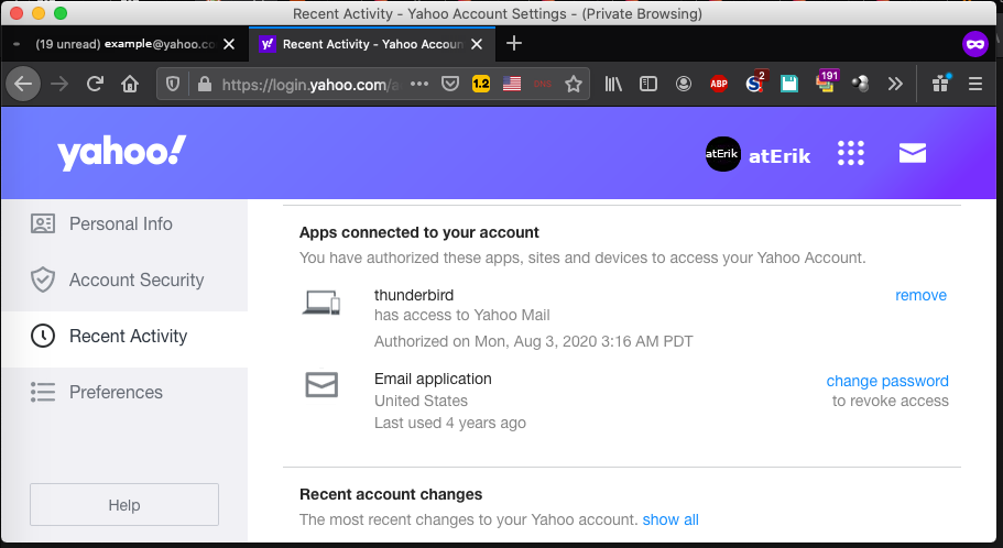 - Thunderbird email client app is approved & added into authorized/approved app list, and it can be seen (via Firefox) inside Yahoo Mail web-access site’s Recent Activity section