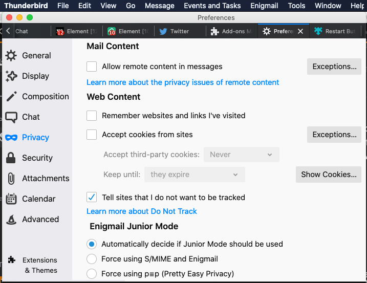 Since you’re using (basic browser) web browser tab(s) inside Thunderbird, & it will not-only connect with primary webmail website, but will also connect with too many different types of websites, So you MUST also install protection addon : AdBlock (or alternative) addon to stop intrusive/annoying/data-stealing ADs. I prefer to use uBlock-Origin addon. But user may Allow simple or Text based small ADs which do not steal (your data) & has obtained your specific permission.