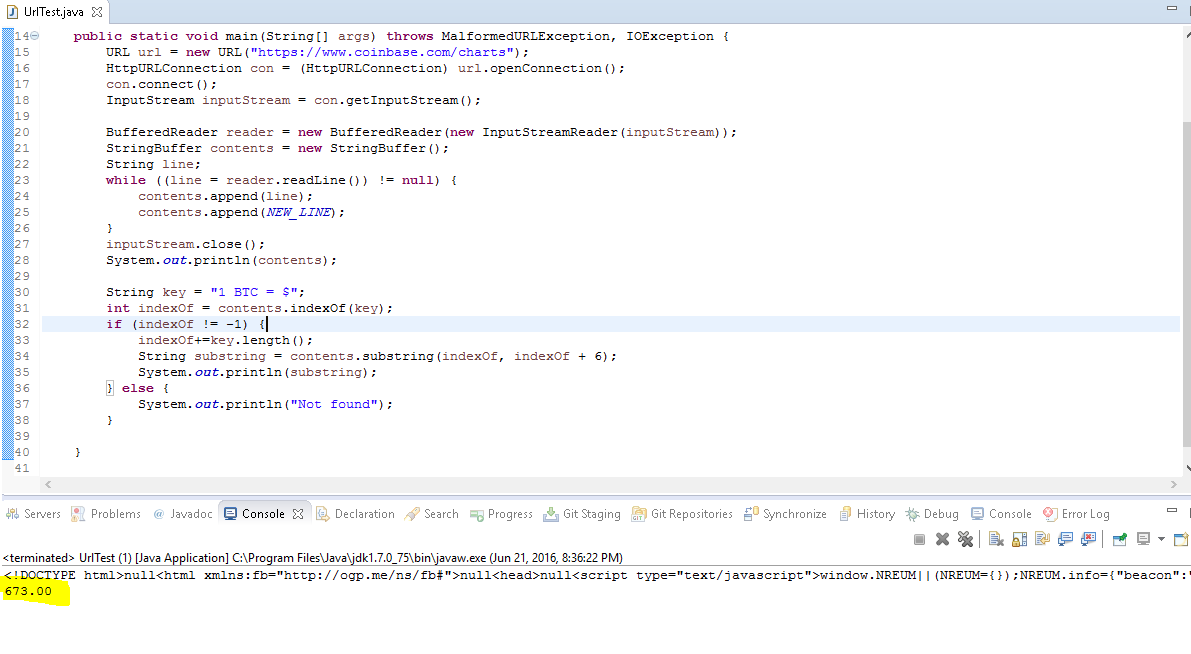 The below example will extract the bit-coin rate to USD from https://www.coinbase.com:
