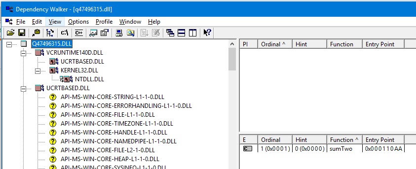 Here’s also a (partial) image of the .dll loaded in Dependency Walker, showing that the function is being exported: