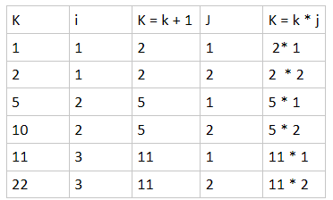 - Then the second iteration of inner loop, j becomes 2 and k is still 2, so k = k (2) * j (2) so k = 4