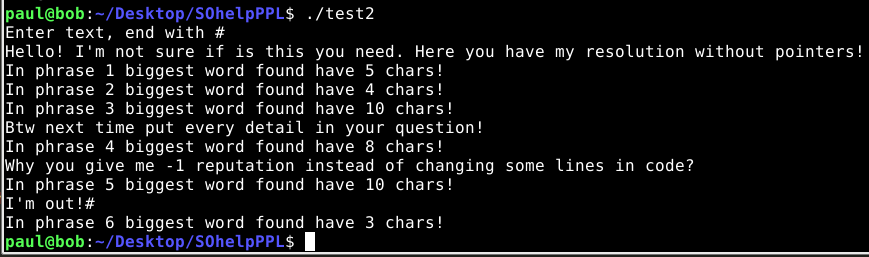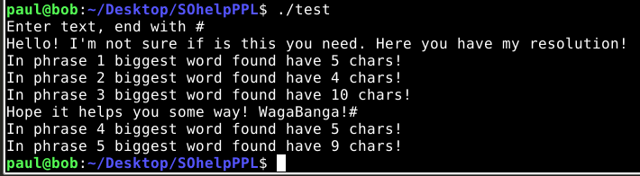 printf("In phrase %d biggest word found have %d chars!\n",++phrase,biggest);