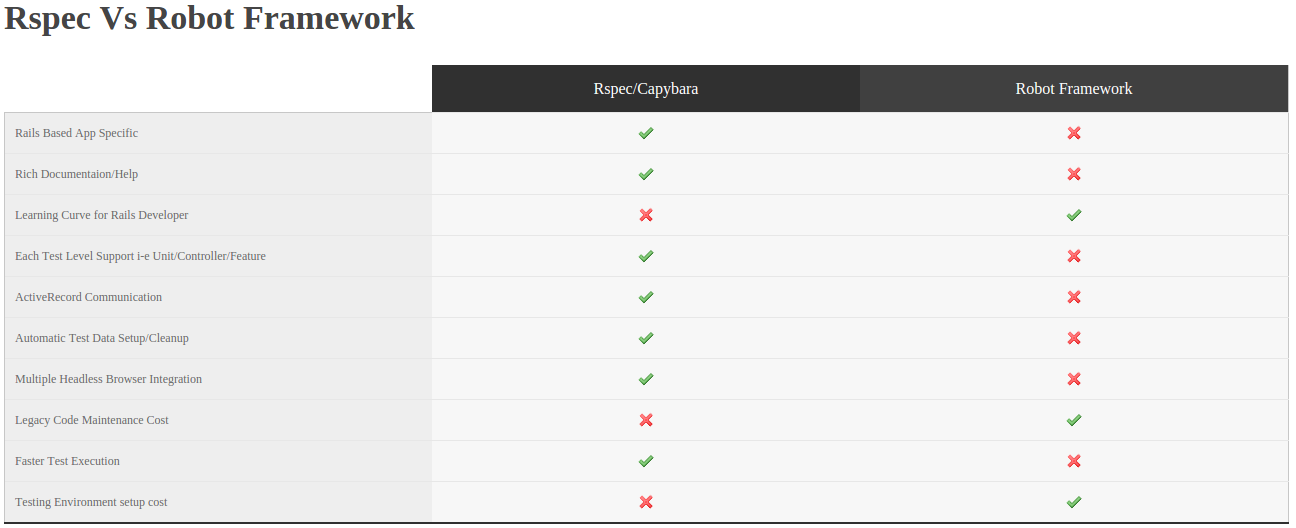 [Solved] Capybara/Selenium vs Robot Framework for Rails September 8, 2022 by Kirat [ad_1]After lot of research I was able to compile following comparison table between Rspec/Capybara vs Robot Framework I am answering this question in case somebody else need it. 2[ad_2]solved Capybara/Selenium vs Robot Framework for Rails