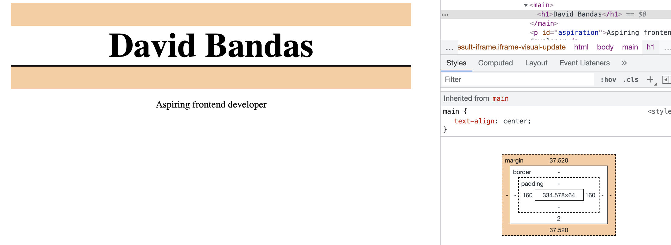 Now highlighting over your HTML elements will display your margins, border, padding of the selected element, so you can see your h1 has a top and bottom margin applied, remember its default styling applied by the browser.
