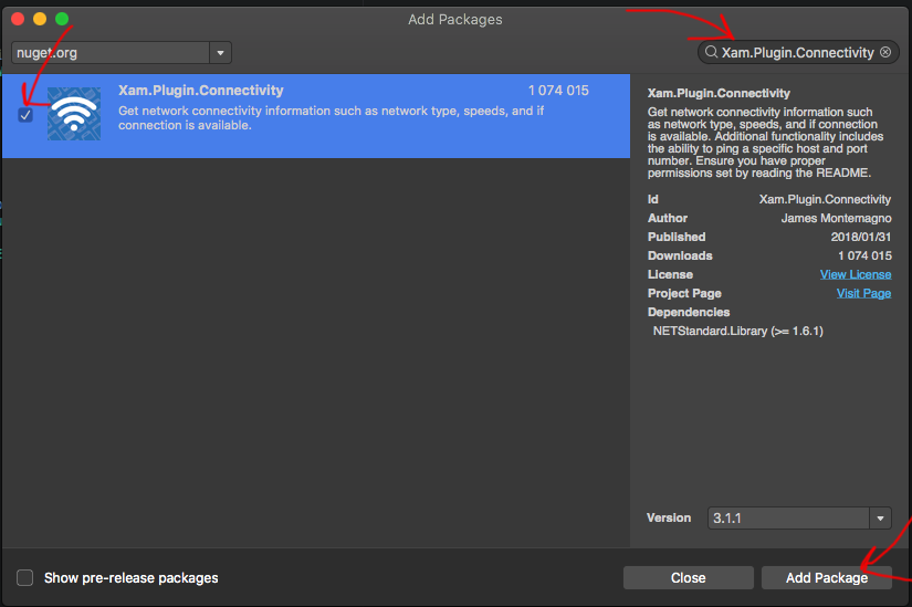 - Search for Xam.Plugin.Connectivity I found the name here (plugins normally have a link on their github branch)