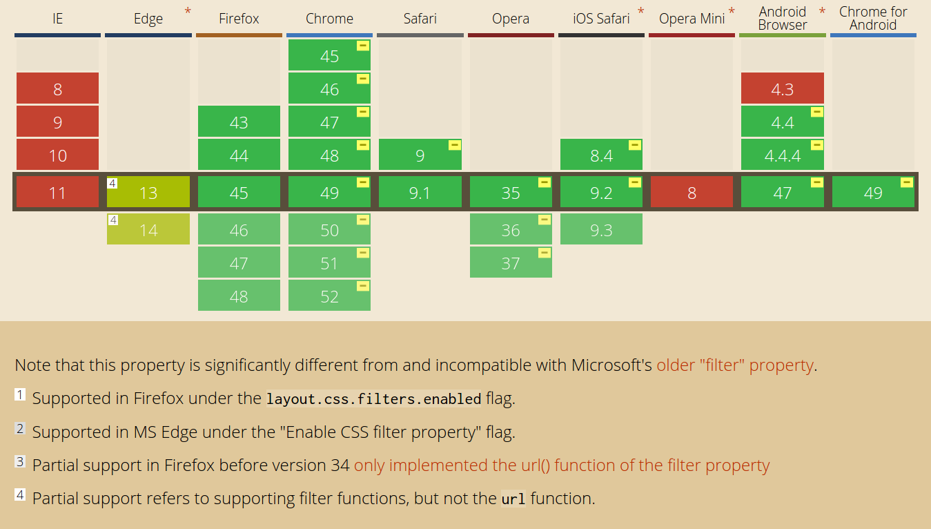 Here’s an overview of which browsers have support for CSS Filters at the moment I’m writing this post (March 25th, 2016) :
