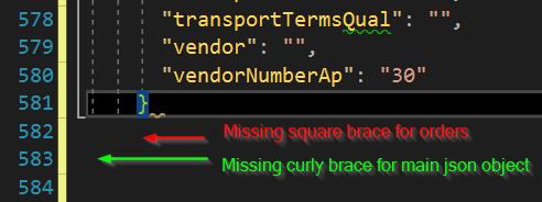 The order collection is missing its closing square brace, and the main json object is missing its closing curly brace: