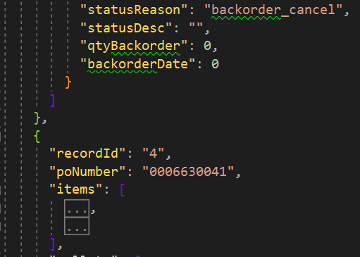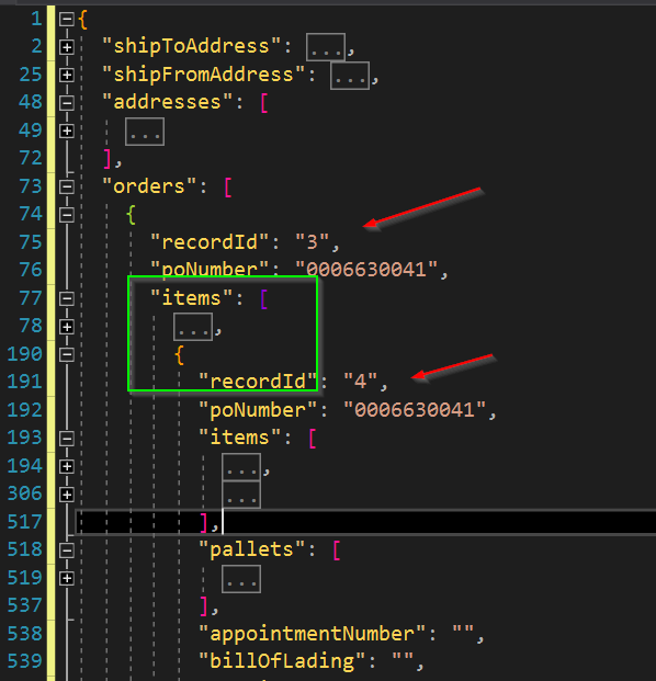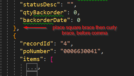 The item collection in the order with recordId 3 is not closed properly. This is resulting in the order with recordId 4 being a child of record 3’s items. Additionally there is no closure to the order record itself (missing curly braces).