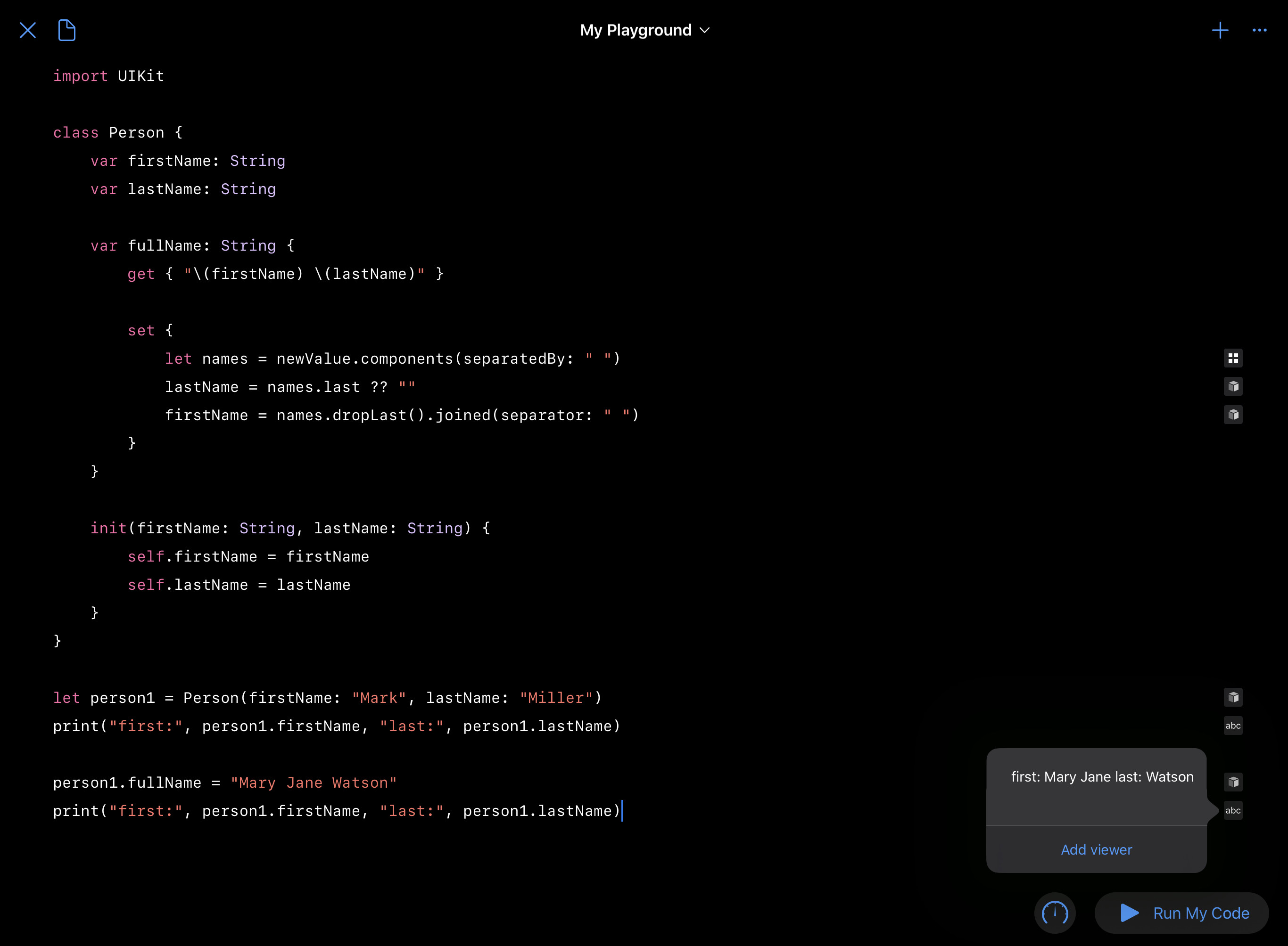 As you can see, I also eliminated the fullName setter given the ambiguity regarding what to do with middle names, prefixes (like “Dr.”), suffixes (like “M.D.”), etc. But you can do whatever you want.