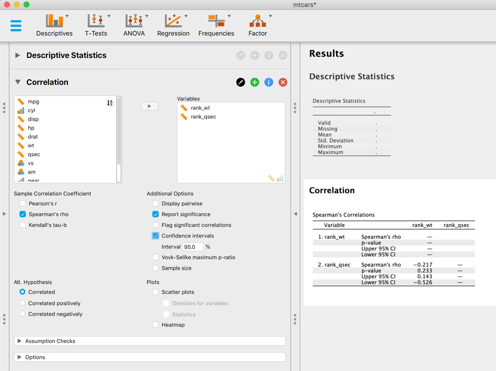 Call:corr.test(x = mtcars$rank_wt, y = mtcars$rank_qsec, method = "spearman",