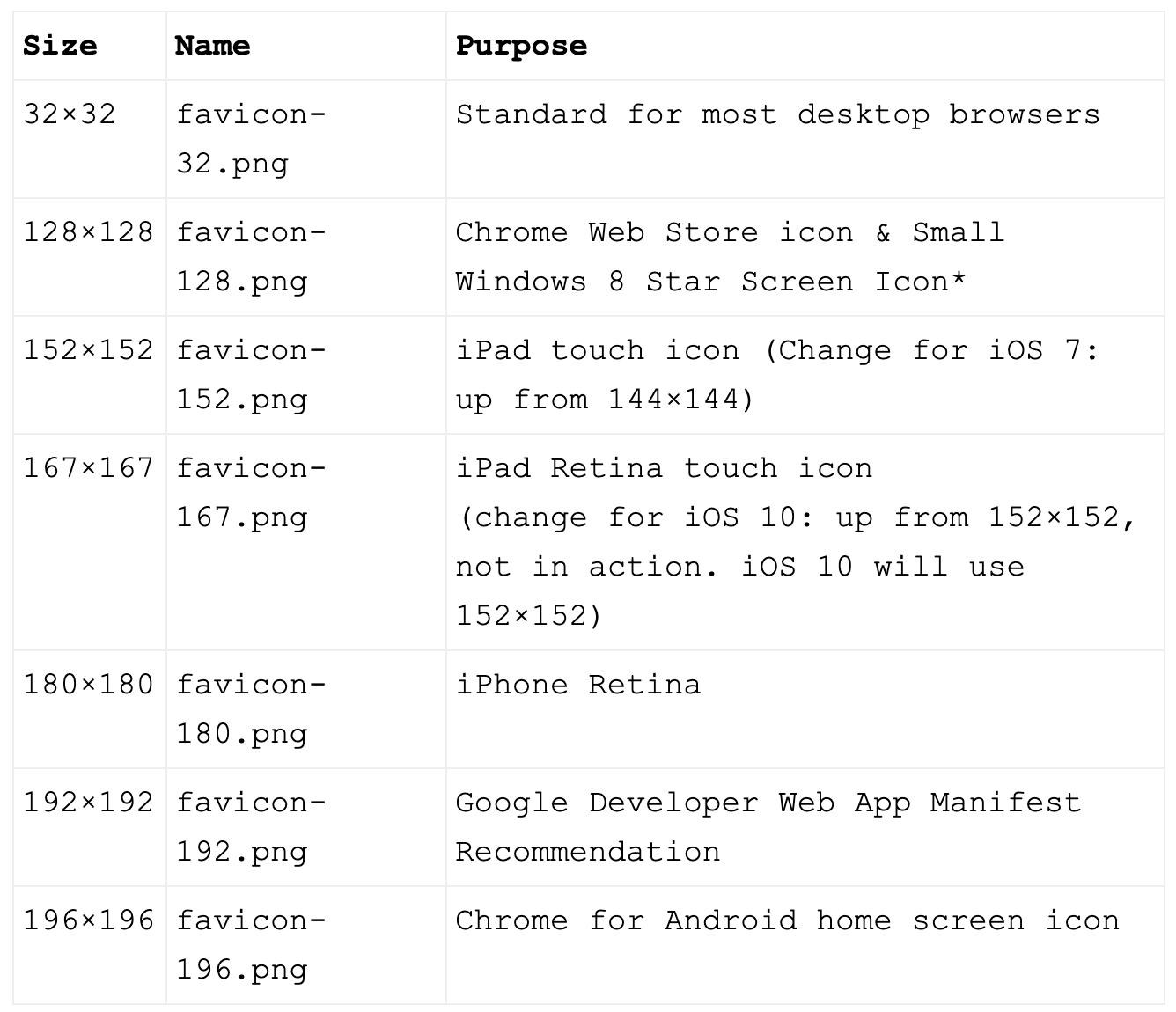 Table of favicon sizes