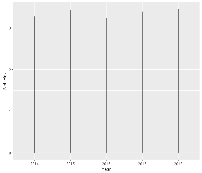 plotLine <- ggplot(sales_clean, aes(Year, Net_Rev, na.rm = FALSE))