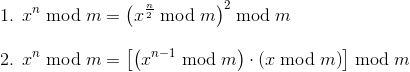 From the first formula it is clear that we can iteratively calculate the modulo for n from the result for n / 2. This is done by the lines