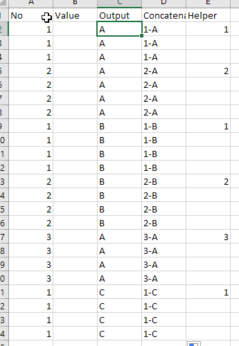In Column C (Output): =IF(E2="",C1,CHAR(COUNTIF($E$2:E2,E2)+64))