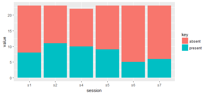 In terms of producing the chart, first you need to organise your data by calling gather so that you can pass the present/absent variable to the fill method in ggplot.