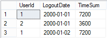SELECT TimeTracker.UserId, CAST(TimeTracker.LogoutTime AS date) AS LogoutDate, SUM(DATEDIFF(SECOND, TimeTracker.LoginTime, TimeTracker.LogoutTime)) AS TimeSum