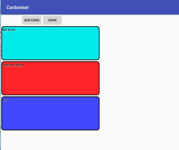 Here’s a completer Custom Cursor Adapter that uses user defined colours extracted from the database to colour each item accordingly using bindView. However, this changes the drawable’s background colour. It’s for Credit Card management (work still in progress ), thus each item in the ListView looks like a Credit Card. :-